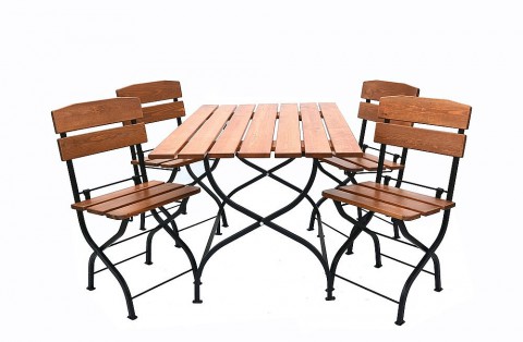 Összecsukható székek és asztal ellenállhatatlan anyagkombinációból: fém és fenyőfa. Frissítse a teraszt, a nyaralót vagy a kocsmát...